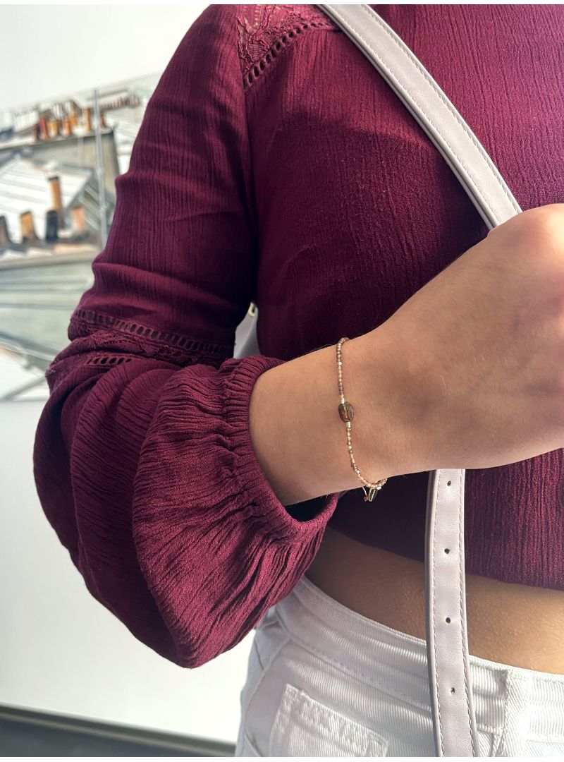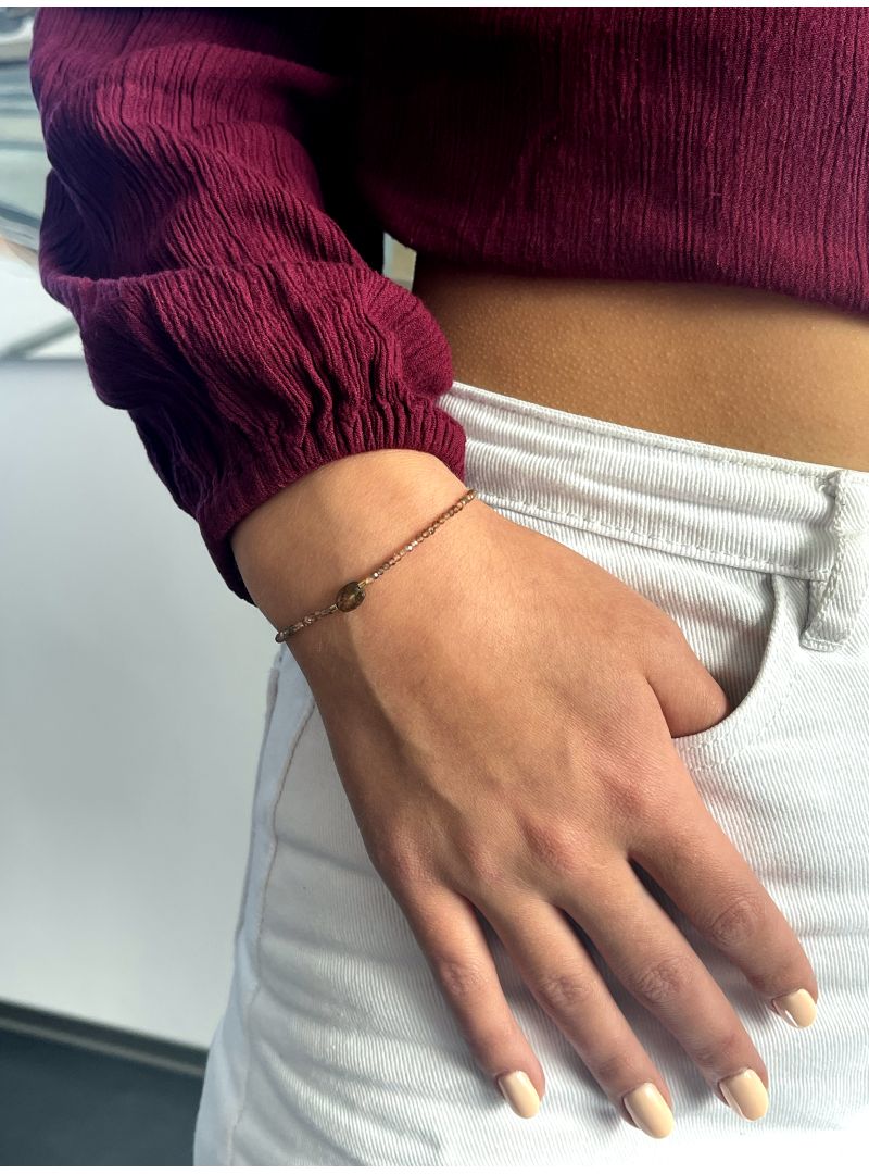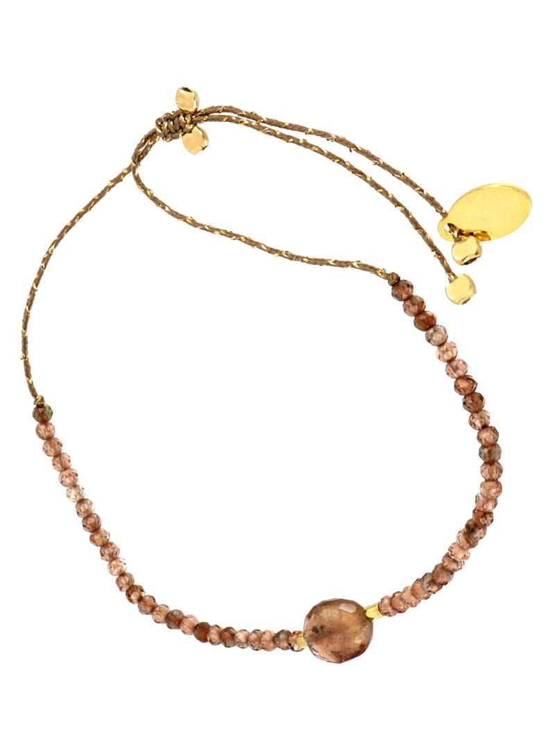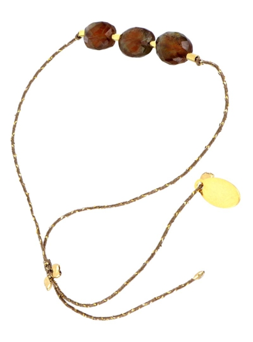 Bracelet réglable grâce à ses cordons coulissants (14cm à 18 cm), en fil lurex taupe doré, agrémenté d’une pierre sertie en Andalousite au milieu et de 25 mini Andalousites de chaque côté