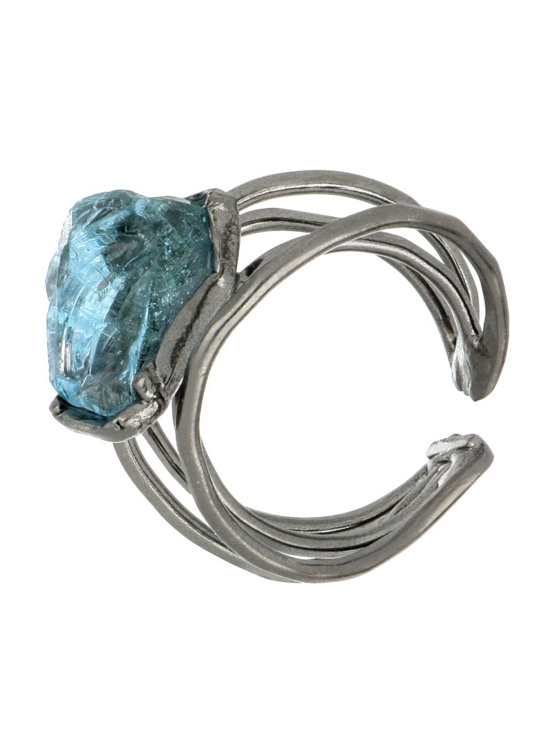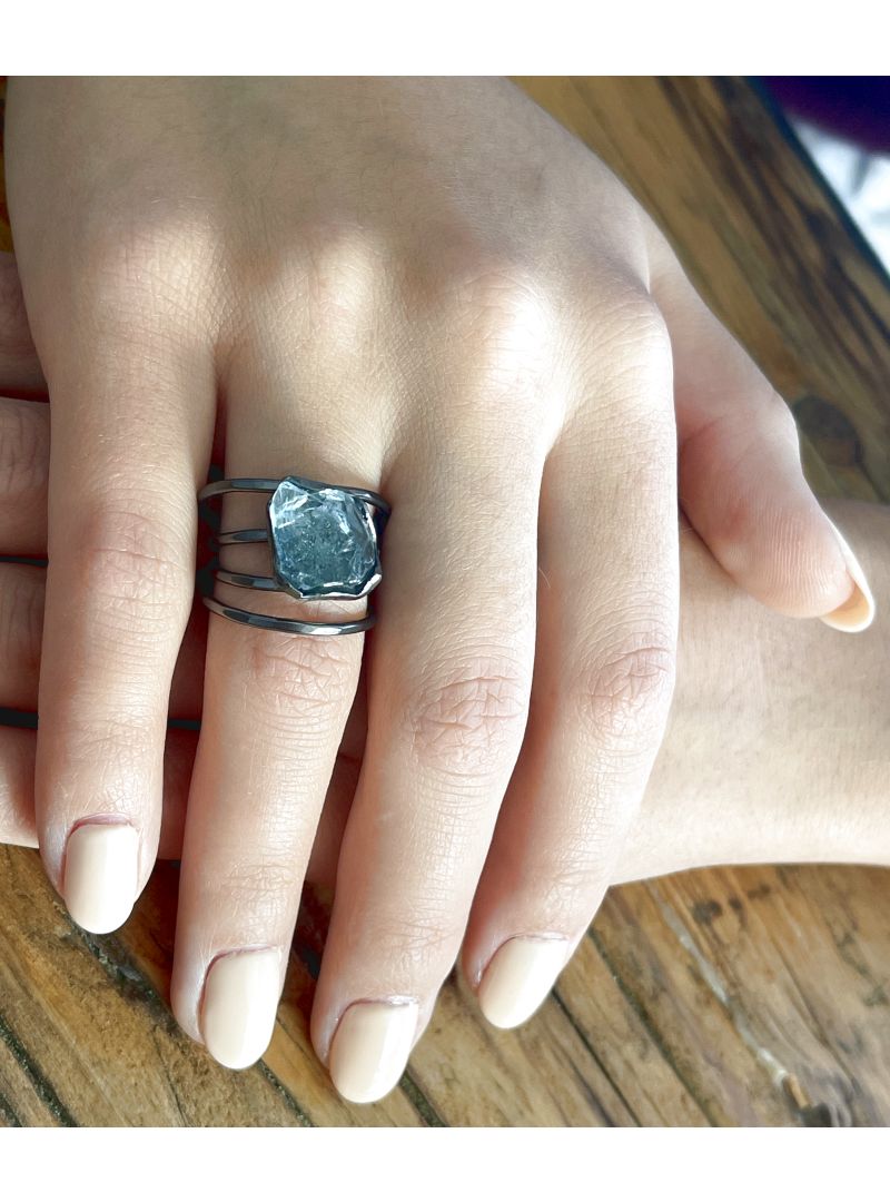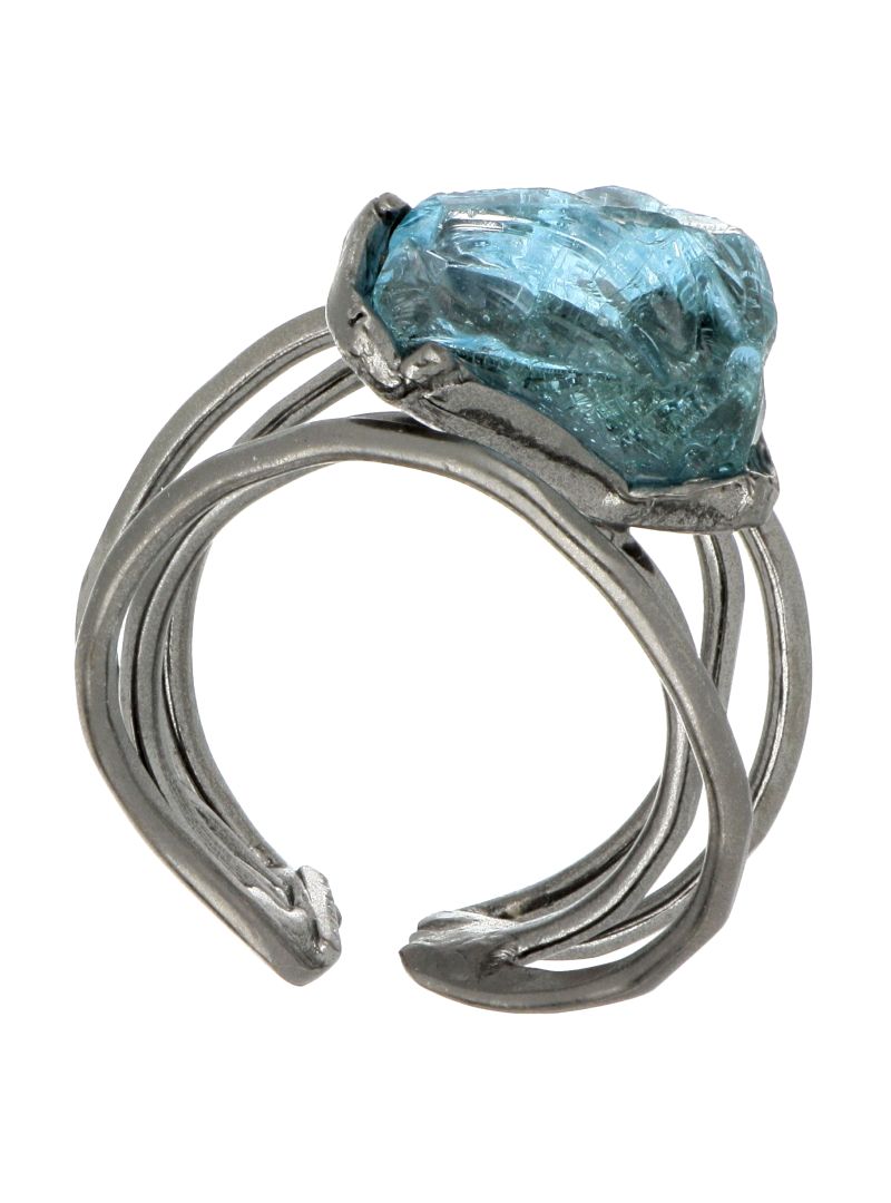 Bague de couleur anthracite ouverte et réglable, sertie d’une pierre en Apatite bleue.