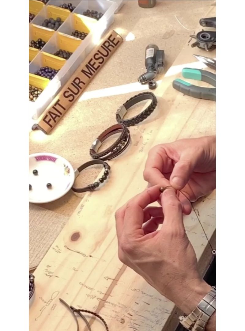 Bracelet en cuir noir, assorti avec des perles en Onyx et en Lave volcanique.