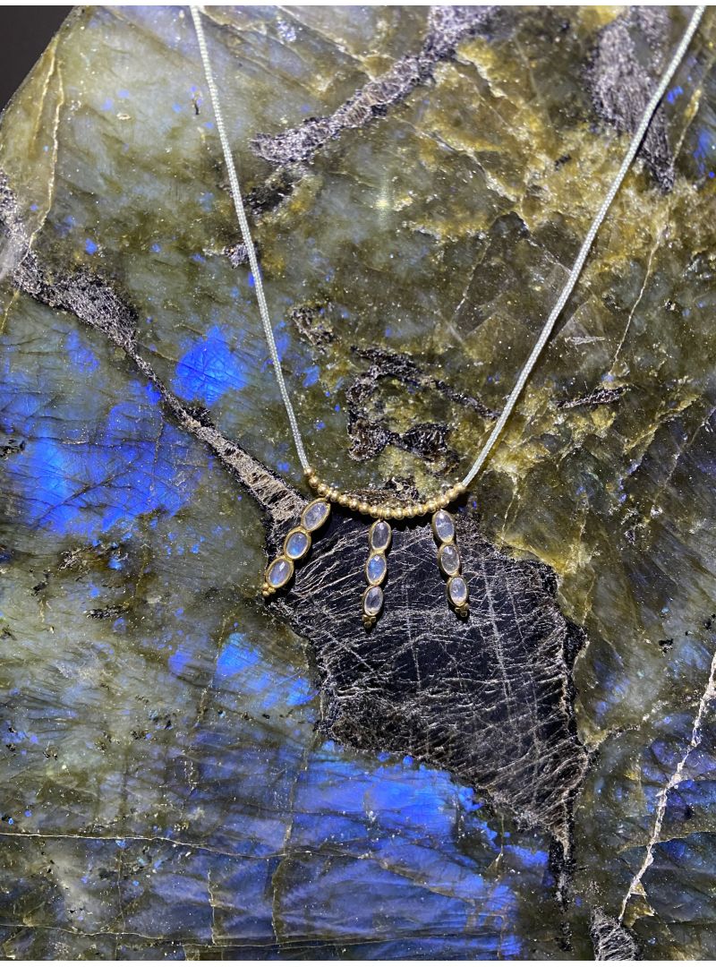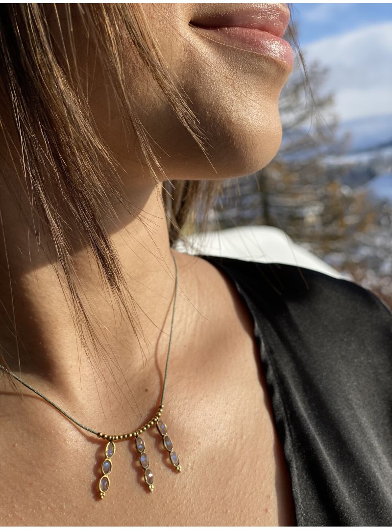 Collier réglable grâce à ses cordons coulissants (38 cm à 42 cm), agrémenté de perles en Vermeil et de pierres serties en Labradorite