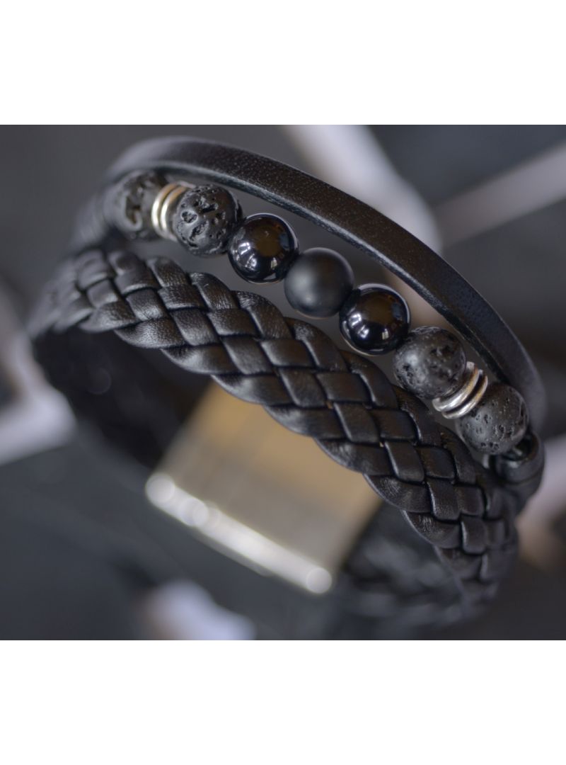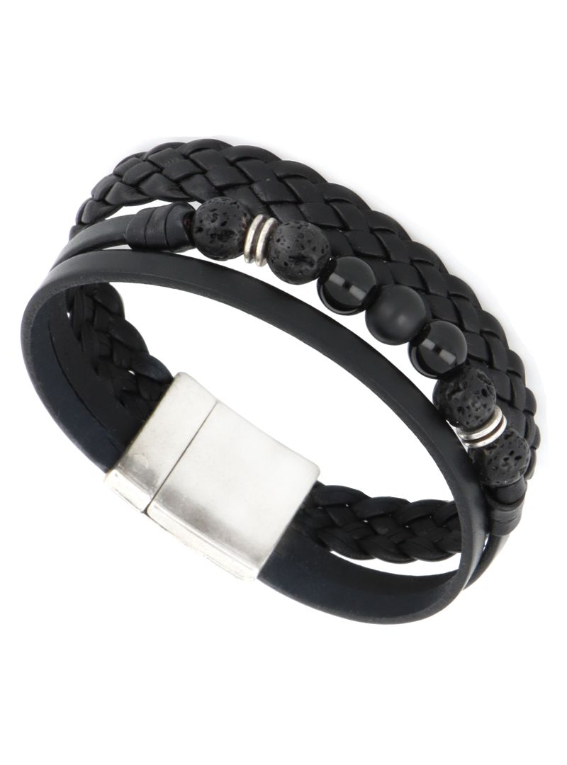 Bracelet en cuir noir, assorti avec des perles en Onyx et en Lave volcanique